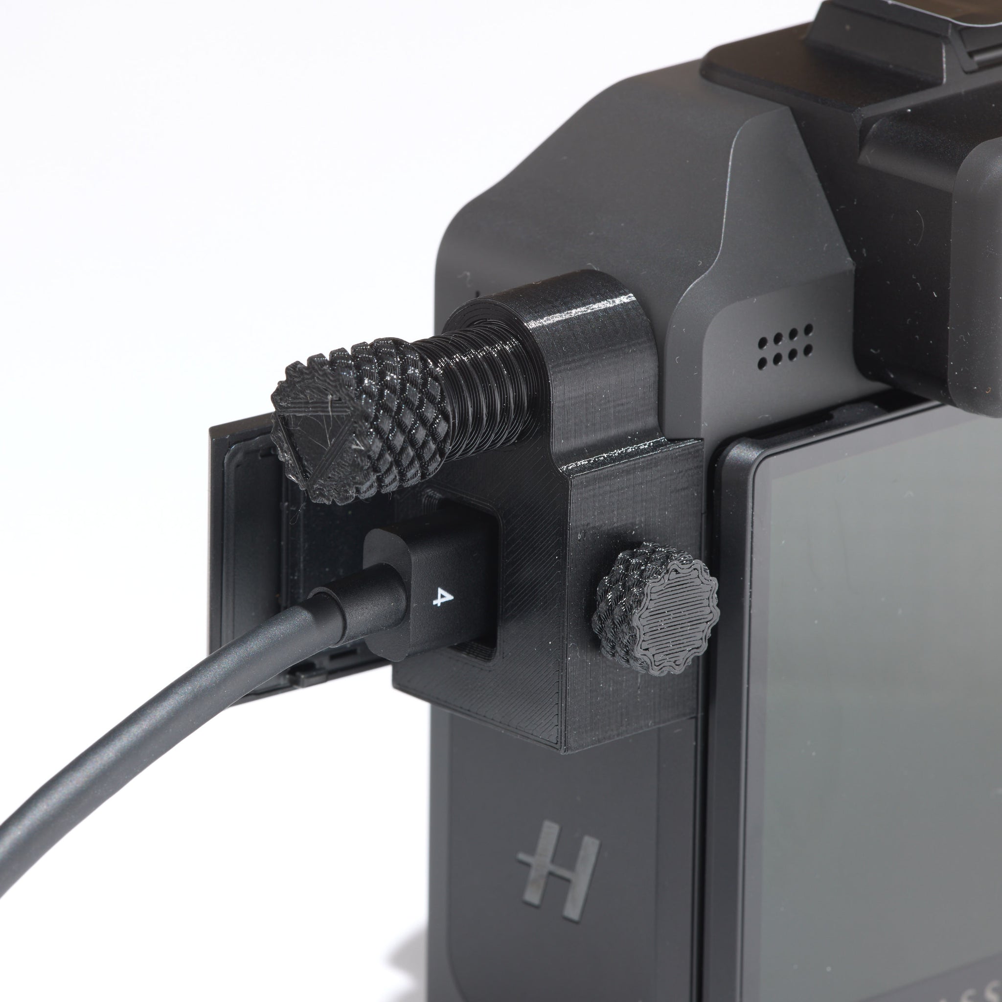 This cable guard is for use on the new Hasselblad X2DII-100c. It is 3d printed in high quality PET-G plastic and will protect your camera's USB-C port and keep your cable from coming loose. This tethering solution snaps on to the shoulder strap lug and then screws into a block that holds the usb cable. The cable clamp is held in place with a set screw and it's strong enough that I can lift the camera by the cable. It should fit most plugs that do not have a 90 degree angle. Other plug sizes will fit by adjusting the included metal grub screw which will help to keep smaller plugs tight and centered in the opening. I'm including a second block that fits plugs from TetherTools very snugly. I'm two set screws with a knurled knob that can be tightened by hand. Please note: the video was made for a previous version, but it still works the same way so I'm leaving it here for reference.